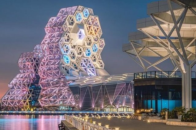 高流建築群包括海風廣場、音浪塔(室內大型表演場館)、鯨魚堤岸(6間小型展演空間)、珊瑚礁群(複合商業空間)、海豚步道、渡輪碼頭、和文創市集等,另還有位於駁二藝術特區大義倉庫的LIVE WAREHOUSE,園區設有人行天橋連接愛河出海口東西兩岸的園區,整體園區內亦設有高雄輕軌真愛碼頭站及光榮碼頭站2個車站。